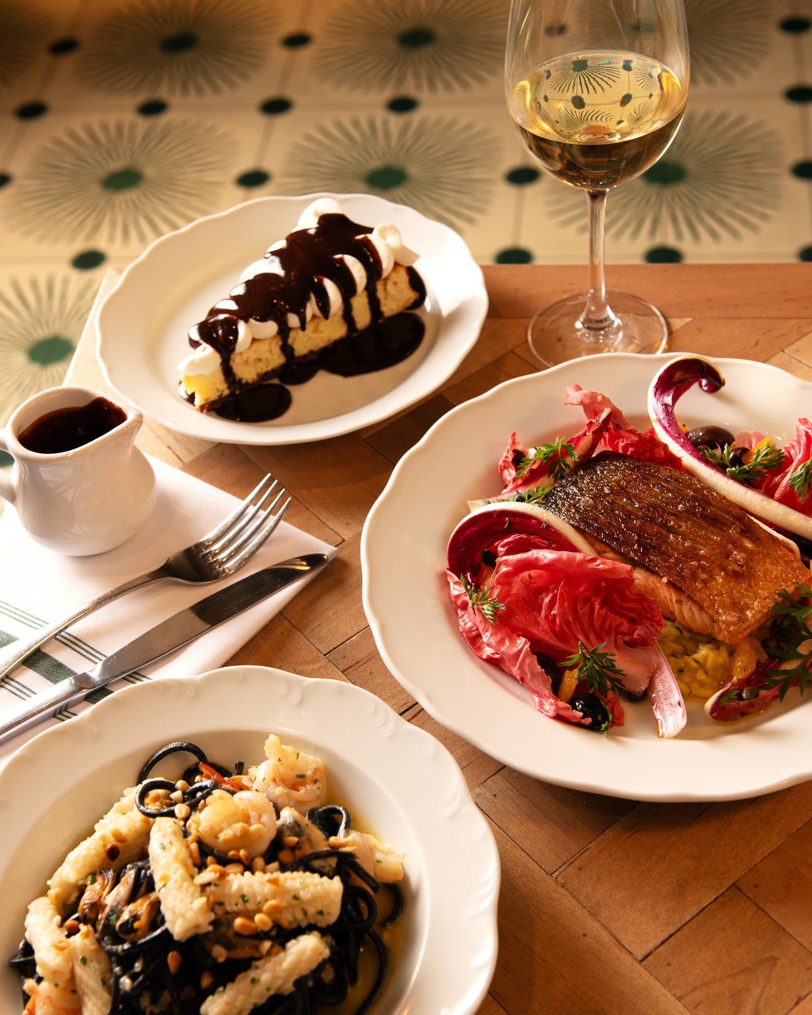 The menu highlights comforting, celebratory dishes that feel perfect for sharing. A rich squid ink chitarra with calamari, mussels, shrimp, and pine nut gremolata brings coastal Italian flavors to the table, while a beautifully prepared salmon with herb risotto, radicchio, olives, and capers offers something lighter yet deeply satisfying. Dessert finishes the evening with a ricotta cheesecake on a biscotti crust, layered with hazelnut chocolate fudge for a sweet ending that feels nostalgic and indulgent.